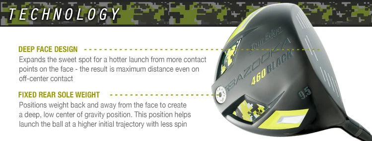 A rear fixed sole weight creates a deep center of gravity to help players of all abilities easily launch the ball down the fairway.  The Bazooka 460 Black driver features a black PVD finish and ‘camo’ design highlights, combining style with power.